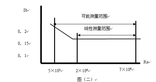 由此可见,经过丈量卡门涡街别离频率便可算出瞬时流量。其间,斯特罗哈尔数(St)是无因次未知数,图(二)表明斯特罗哈尔数(St)与雷诺数(Re)的联系。