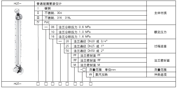 HG5型普通玻璃管液位计产品选型编码 注:测量管(玻璃管)可选用F46管 ![]() |