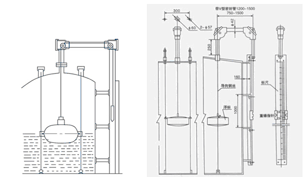 液位计是由浮标、连接钢丝、导向滑轮、重锤指针、显示标尺等五部分组成。
