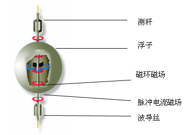 传感器工作时,电路部分将在波导丝上激励出脉冲电流,该电流沿波导丝传播时会在波导丝的周围产生脉冲电磁场。在传感器测杆外配有一浮子,此浮子可沿测杆随液位的变化而上下移动。在浮子内部有一组永久磁环。当脉冲电流磁场与浮子产生的磁环磁场相遇时,浮子周围的磁场发生改变从而使得由磁致伸缩材料做成的波导丝在浮子所在的位置产生一个扭转波脉冲,这个脉冲以固定的速度沿波导丝传回并由检出机构检出。通过测量脉冲电流与扭转波的时间差可以精确地确定浮子所在的位置,即液面的位置。